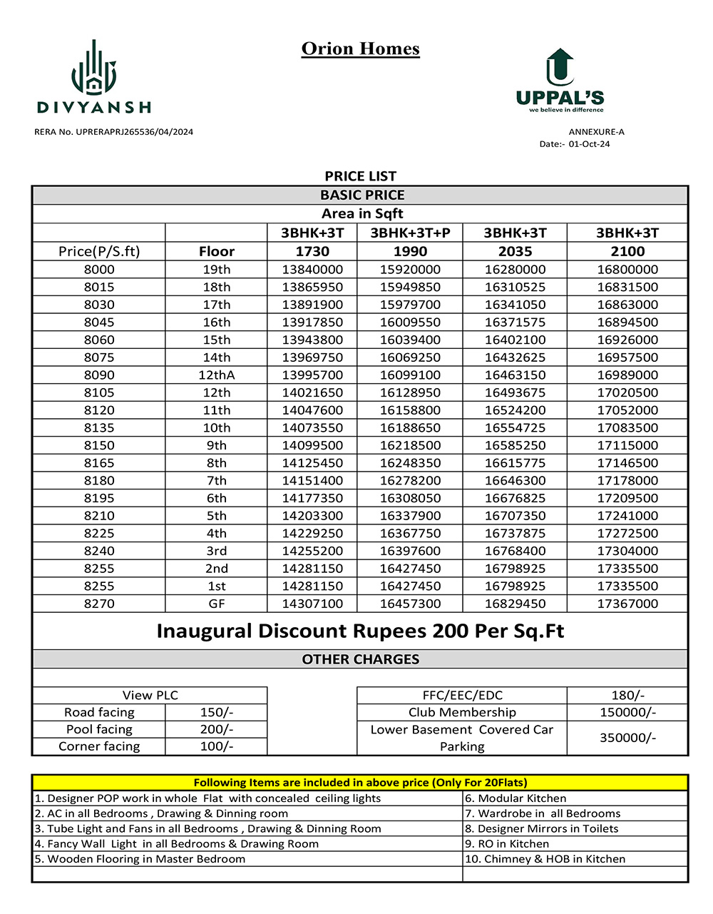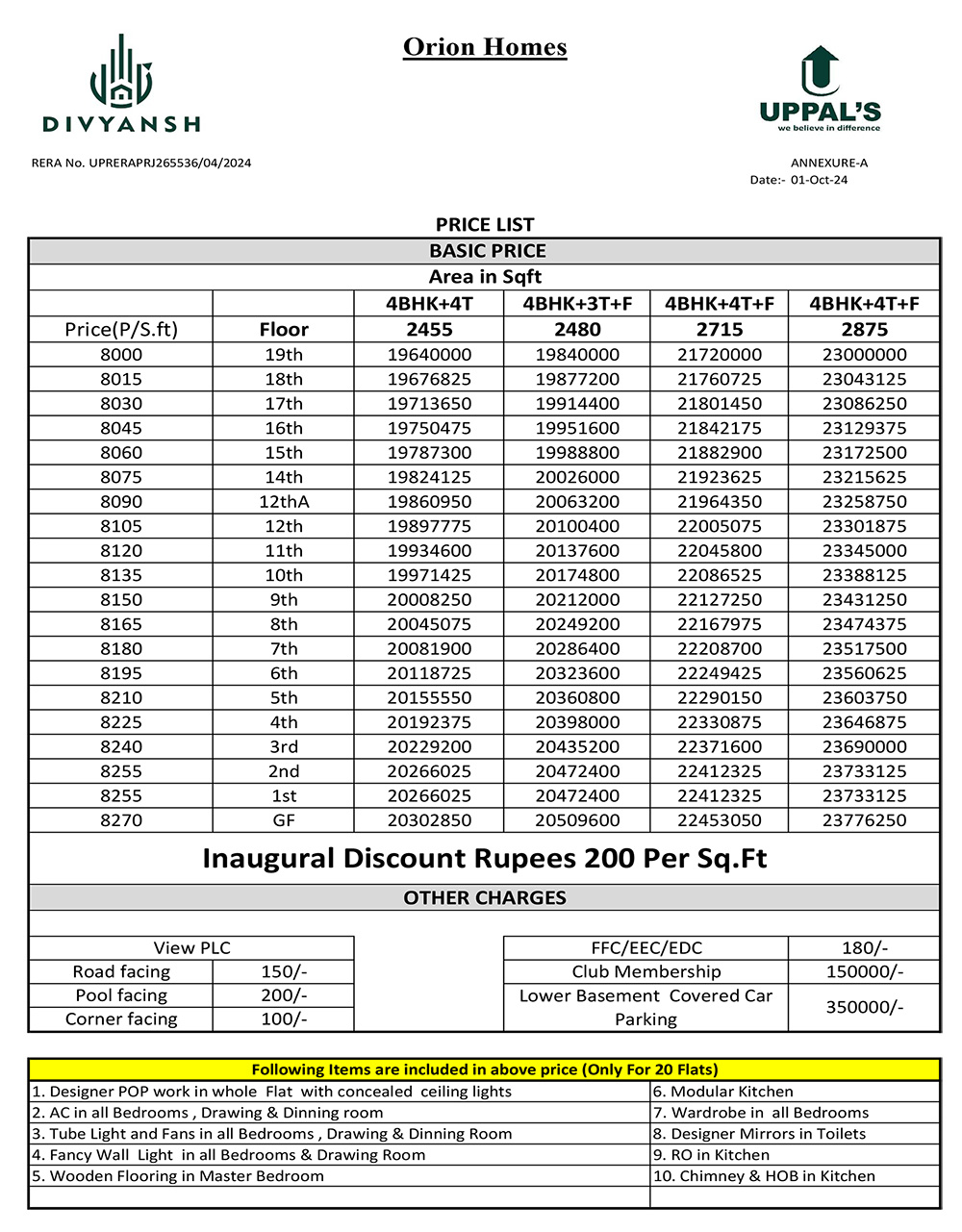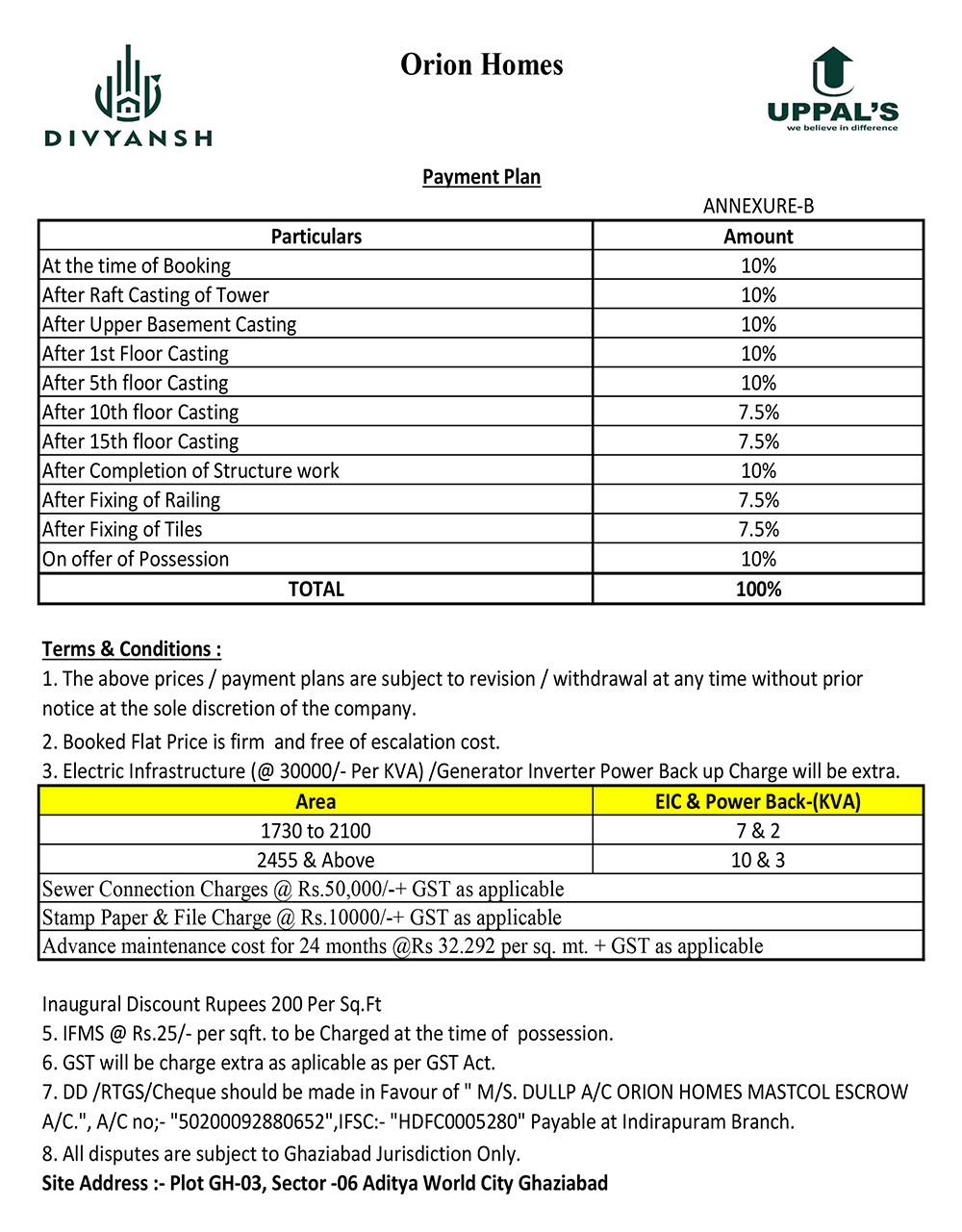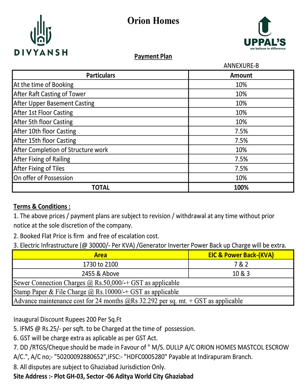 Divyansh Orion NH24, Ghaziabad offers 3 & 4 BHK luxury and spacious apartments with Lawn, Seating Pavilliona, Open Gym, Raised Planters, Metal Tree Court, Rose Garden, Reflexology Path, Bar-Beque, Palm Court, Seating Deck, Yoga Platform, Refreshment Bar, etc. This premium and 3-sides open project has a premium club with most of the modern games & sports facilities. These dream home apartments would have an RCC-framed structure certified by IIT. With a trusted legacy of years of penance, dedication, and success Divyansh Homes and UPPAL always have thrived since its inception under the legendary leadership of top officials. These modern living with smart living and smart choices could find every category of families fit for the best living together with children, old age, and friends. Every real estate lover will find its super sophisticated local and remote resources like smart roads, streets, numerous facility centers, next-gen transportation led by DND & FNG corridor, national highways, expressways, airports, and others.